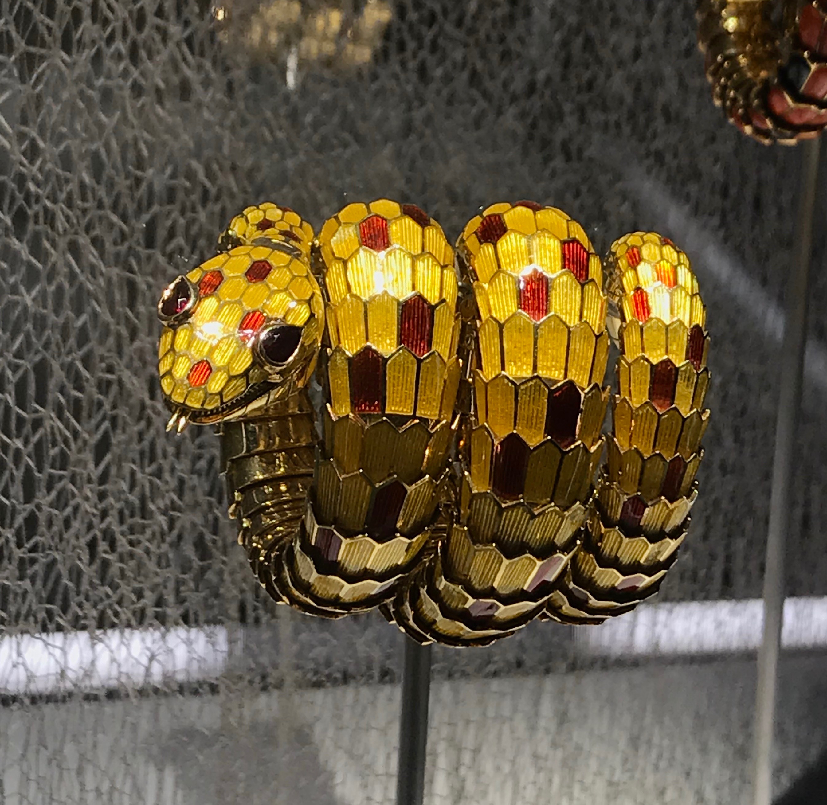 Parmi les créations les plus iconiques et distinctives de la Maison se trouvent notamment les bijoux en or sertis de pièces anciennes, les fabuleux cabochons de pierres de couleurs et une belle collection de bracelets montres Serpenti.