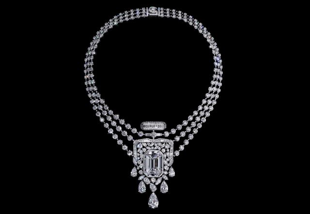 Le profil du bouchon, la silhouette du flacon, le fermoir en forme du chiffre porte-bonheur et la chute de diamants poires de différentes tailles, ajustés un à un, composent cette pièce unique en tout point, comme un hommage absolu au parfum.