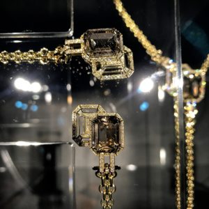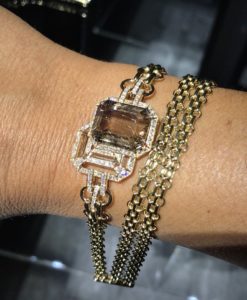 La chaîne du sac CHANEL 2.55 et l’iconic octogone de la Place Vendôme se parent de diamants, de quartz rutile ou de tourmaline créant une collection aux lignes graphiques épurées.