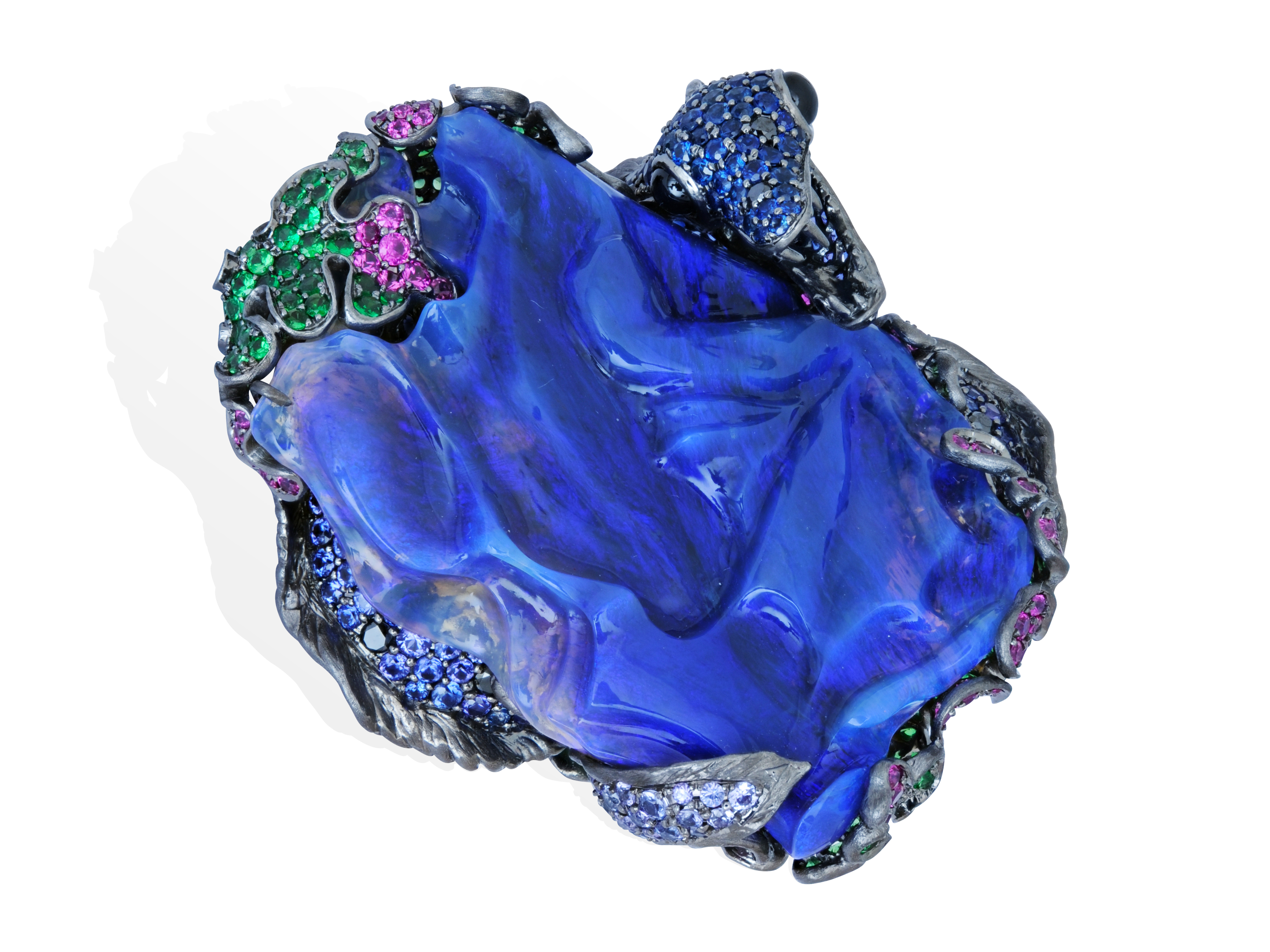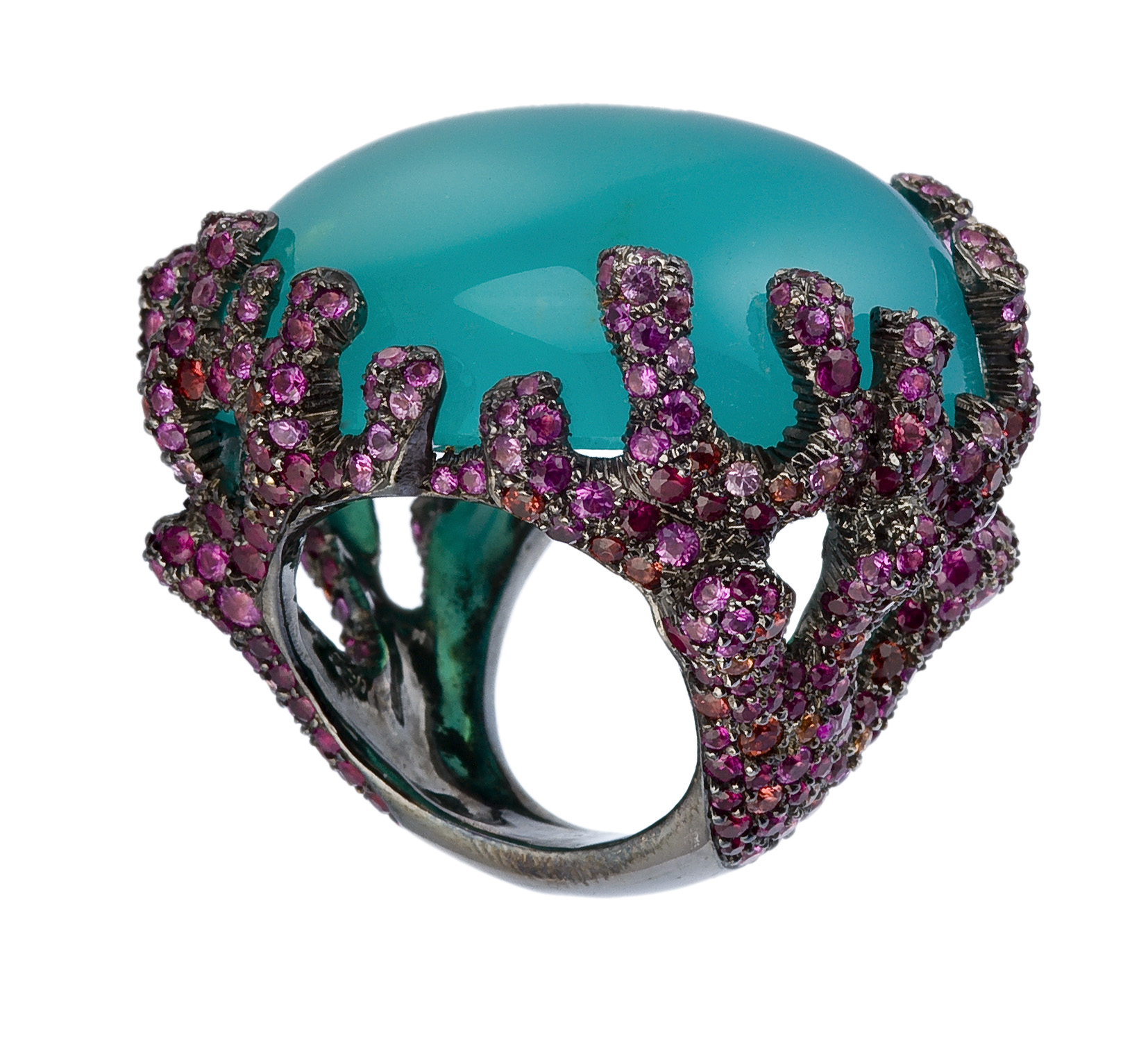 Agate Blue Druzy, Diamants, Diamants Noirs, Spinelle, Topazes Blanches, Or Noir, Or Blanc.