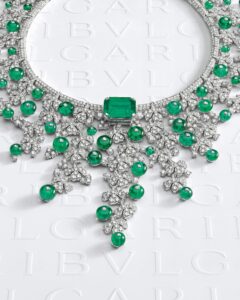 Près de 140 chefs-d’oeuvre émerveillent, ils sont ornés de pierres précieuses aux couleurs gourmandes dont 30 créations sont dédiées l’émeraude. Une fois de plus BVLGARI est un maître des pierres de couleur.