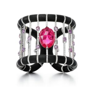 Bracelet en fibre de carbone et or blanc orné d’une rubellite, de saphirs roses et de diamants.