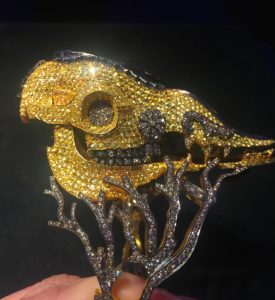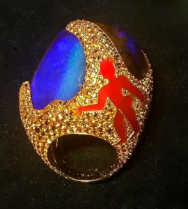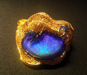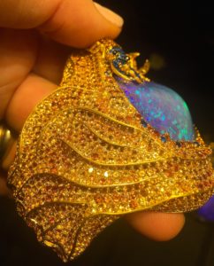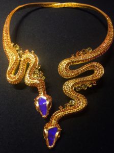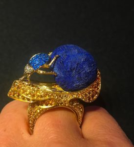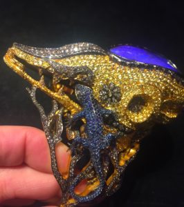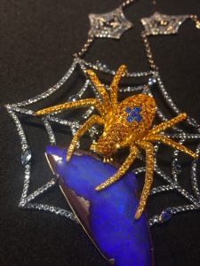 De plus, Lydia Courteille associe l’opale bleue d’Australie à de l’or, des topazolites à des diamants et des saphirs. Qui plus est, par ce voyage onirique et bi-chromatique fait de jaune et bleu, Lydia nous emmène aussi à la rencontre d’animaux surprenants. Tel ce collier serpent ou ce collier araignée.