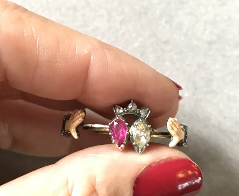 The second ring of special note is a Renaissance gimmel (meaning “twin”) ring dated 1631. It was a marriage ring for a German couple, whose names are inscribed, reminding them of birth and death, through the presence of an enameled baby and skeleton. Set with a ruby and a diamond, the ring was in the Rothschild Collection, stolen from the family in Paris, then hidden by the Nazis in the salt mines with works like Jan van Eyck’s Ghent Altarpiece, and eventually restituted. The story of its origins and subsequent history is amazing. It too is in the Griffin Collection on deposit in the Metropolitan Museum of Art.