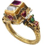 Le deuxième anneau est une bague Renaissance de gimmel datant de 1631. Il s’agissait d’un anneau de mariage pour un couple allemand dont les noms sont inscrits, en leur rappelant la naissance et la mort, par la présence d’un bébé émaillé et squelette. Serti d’un rubis et d’un diamant, l’anneau était dans la collection Rothschild, volé à la famille à Paris, puis caché par les nazis dans les mines de sel avec des œuvres comme le retable de Gand de Jan van Eyck et restitué. L’histoire de ses origines et de son histoire ultérieure est incroyable. Il est également dans la collection Griffin en dépôt dans le Metropolitan Museum of Art.