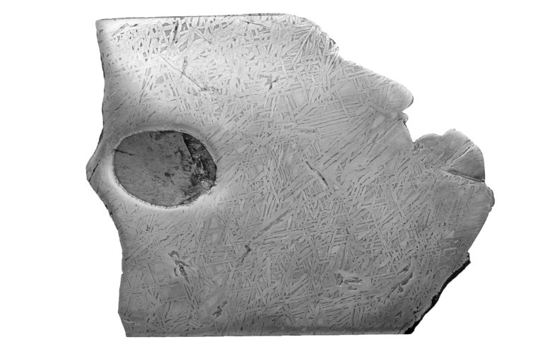 En déposant de l’acide sur une météorite de fer, des figures géométriques apparaissent : les figures de Widmanstätten. Ce n’est pas le cas sur un échantillon de fer issu de la métallurgie car ces figures sont caractéristiques d’un métal qui a mis des millions d’années à refroidir. C’est donc une méthode efficace pour reconnaître du fer météoritique. © Esprit Joaillerie