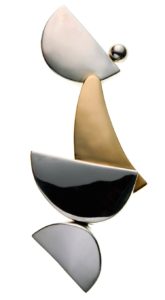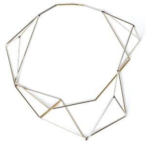 Celui de François Morellet. Il est décédé l’année dernière, c’était un formidable artiste minimaliste français, doté aussi d’un grand sens de l’humour. Il avait déjà réalisé un bijou et a accepté à partir de 2012 d’en réaliser d’autres avec moi. Le pendentif-broche « D’Après Réflexion » est inspiré d’une installation de Morellet intitulé « Après Réflexion » qui avait été exposée à Beaubourg lors de sa rétrospective en 2013.