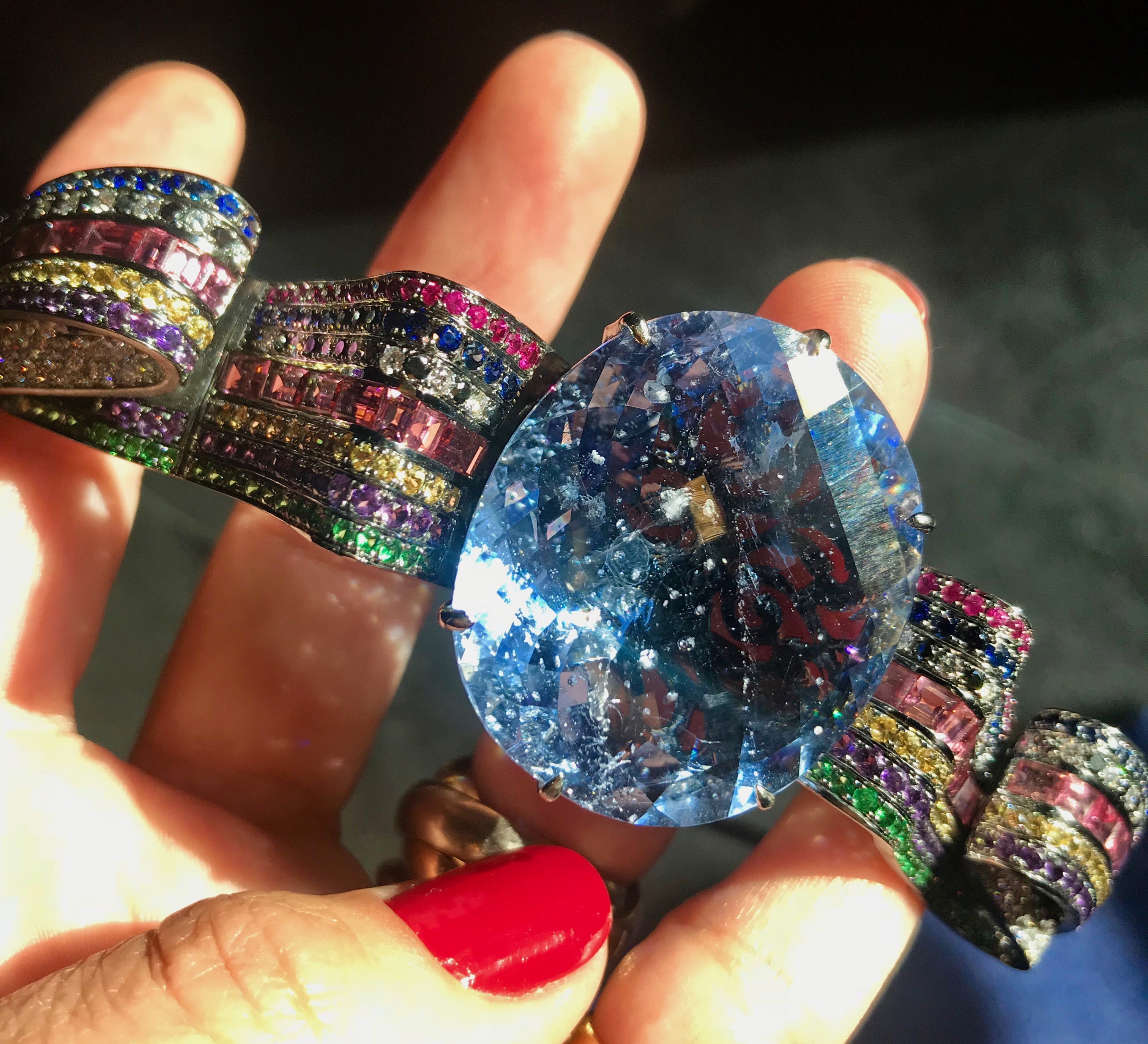Ce sont des créations avec de belles couleurs vives, on y retrouve la passion pour les pierres d’exceptions de Lydia Courteille comme cette tiare ornée d’un important béryl bleu.