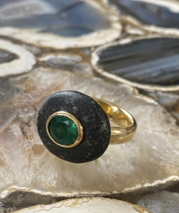 La bague « Chocolat Menthe », je me suis inspiré de mon enfance pour créer cette bague. Il y avait une catégorie de dessin animé japonais très populaire qu’on appelait « magical girl » que j’adorais. C’était souvent l’histoire d’une fille dite banale qui découvre un objet magique qui la transforme en super girl pour sauver la planète. Je crois que c’est réussi parce que cette bague est réellement magique ! Elle présente une émeraude et des diamants entourées de bois, d’or jaune et d’or rose.