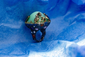 « Toutes mes pièces ont une histoire, par exemple la bague : « Papa Maman Hippocampes décident d’adopter un oeuf de poule »
