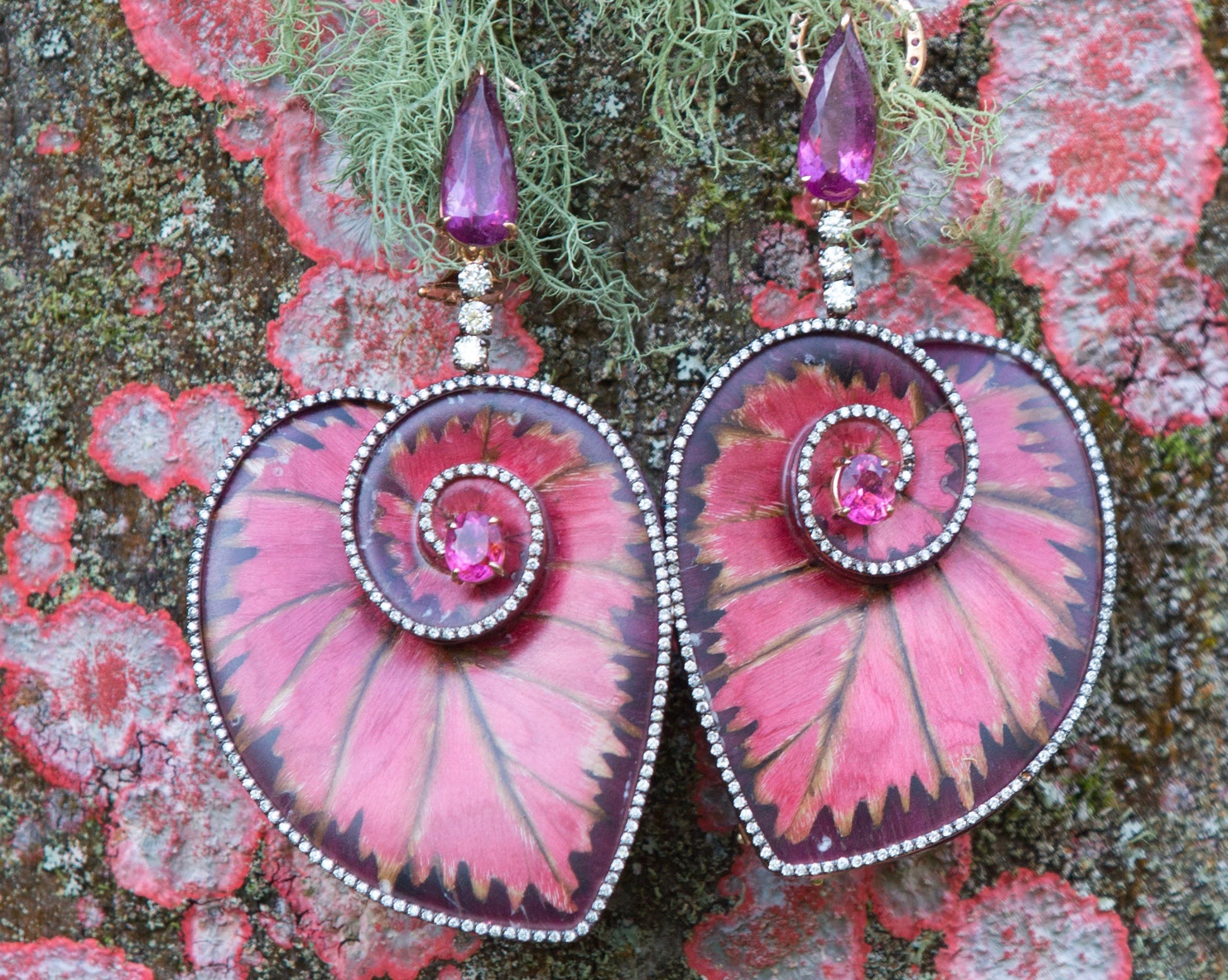 Cette créatrice de bijoux brésilienne est visionnaire et audacieuse, elle associe les pierres précieuses à des matériaux naturels et étonnants comme des fleurs, des ailes de papillons…