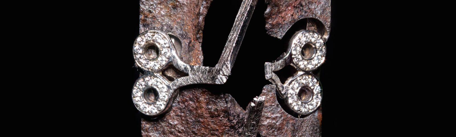 Le pendentif 1915 est en or, acier rouillé et diamants.